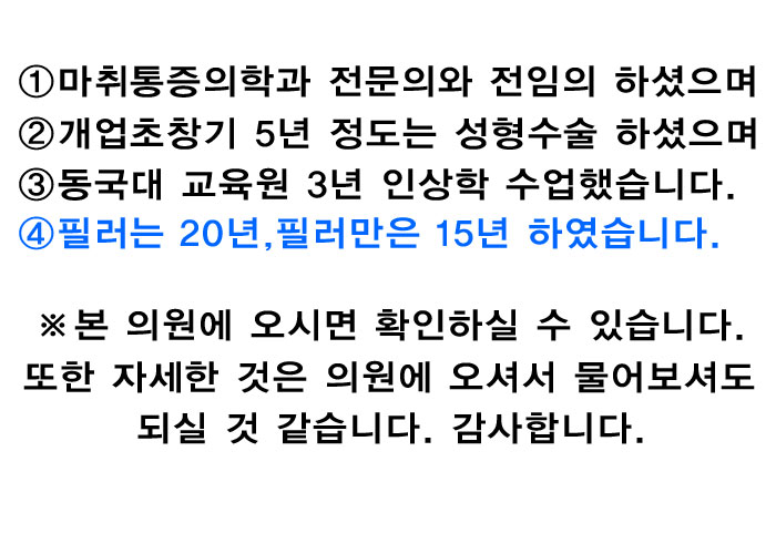 | ¾Æ¸£º¸´Â ÇÊ·¯½Ã¼ú¸¸ ÇÏ´Â ÀÇ¿øÀÔ´Ï´Ù. 20³â ÇÊ·¯½Ã¼úÇØ¿ÔÀ¸¸ç,ÇÊ·¯½Ã¼ú¸¸Àº 15³â µÇ¾ú½À´Ï´Ù. |